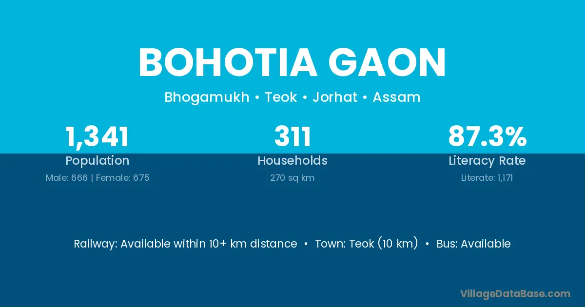 Teok (10 km) is the nearest town to Bohotia Gaon village for major economic activities and is located approximately 10 km away.