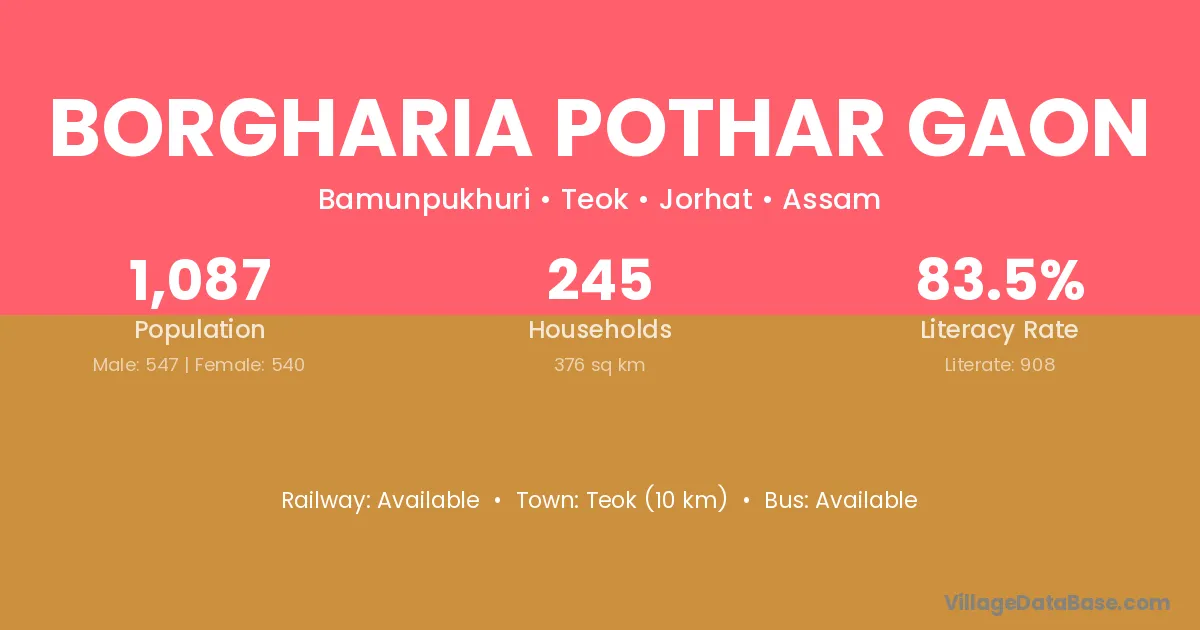 Borgharia Pothar Gaon village has a total population of 1,087 people, of which 547 are males and 540 are females.