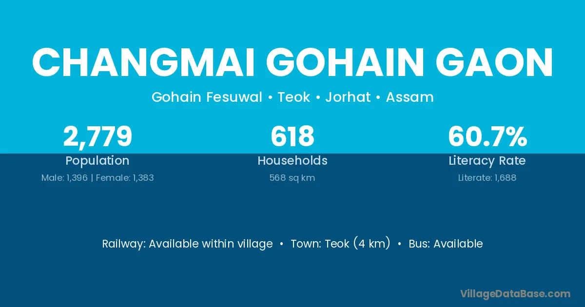 Teok (4 km) is the nearest town to Changmai Gohain Gaon village for major economic activities and is located approximately 4 km away.