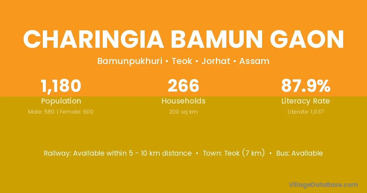 Charingia Bamun Gaon village has a total population of 1,180 people, of which 580 are males and 600 are females.