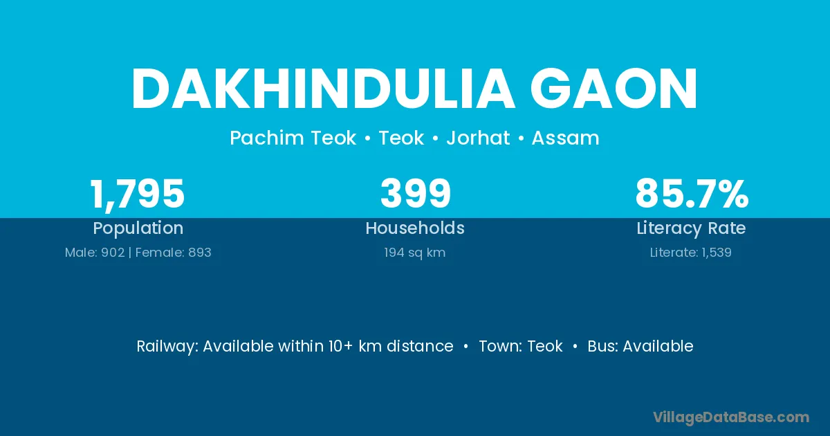 Dakhindulia Gaon village has a total population of 1,795 people, of which 902 are males and 893 are females.
