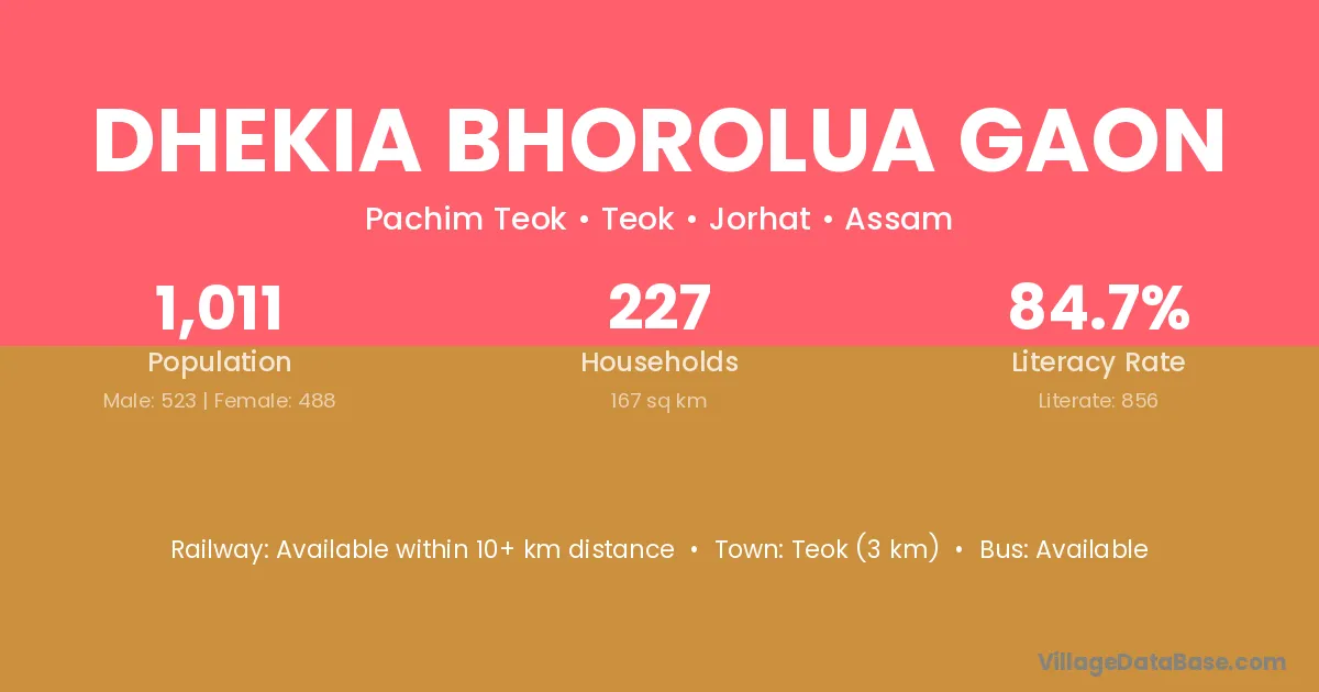 Dhekia Bhorolua Gaon village has a total population of 1,011 people, of which 523 are males and 488 are females.