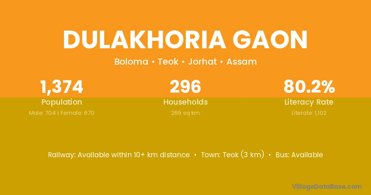 Teok (3 km) is the nearest town to Dulakhoria Gaon village for major economic activities and is located approximately 3 km away.