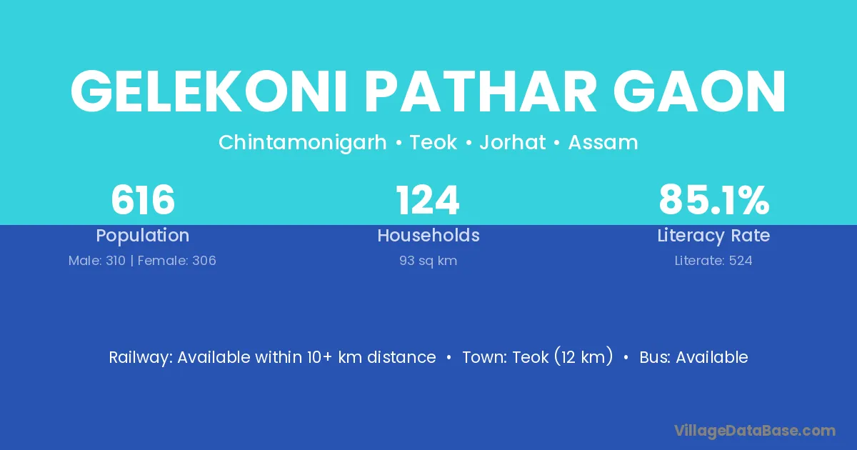 Gelekoni Pathar Gaon village has a total population of 616 people, of which 310 are males and 306 are females.