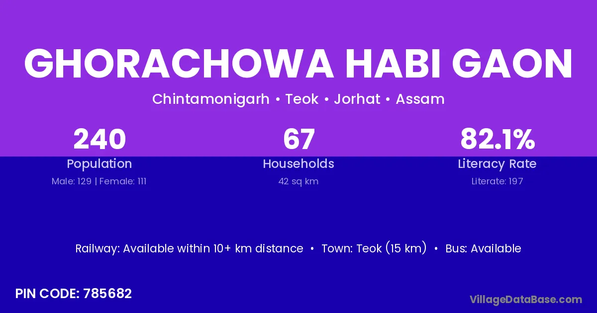 Teok (15 km) is the nearest town to Ghorachowa Habi Gaon village for major economic activities and is located approximately 15 km away.