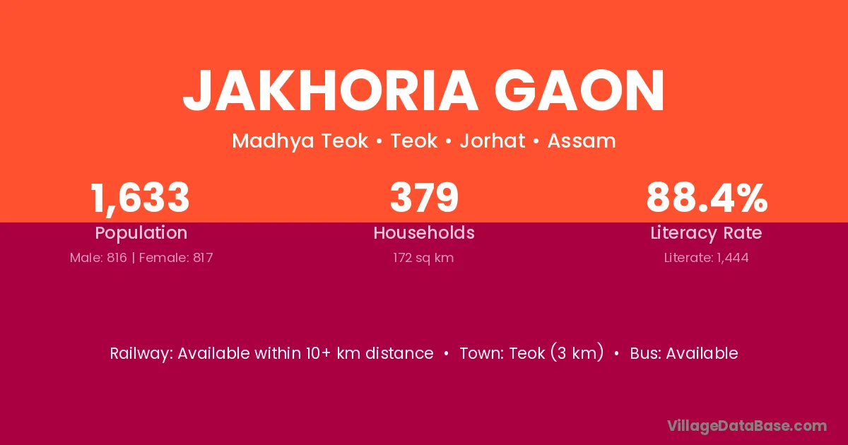 Teok (3 km) is the nearest town to Jakhoria Gaon village for major economic activities and is located approximately 3 km away.