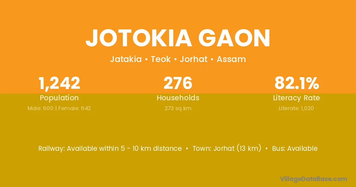 Jotokia Gaon village has a total population of 1,242 people, of which 600 are males and 642 are females.