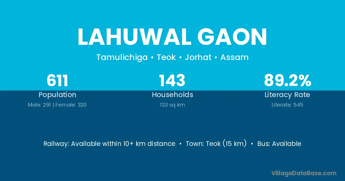 Lahuwal Gaon village has a total population of 611 people, of which 291 are males and 320 are females.
