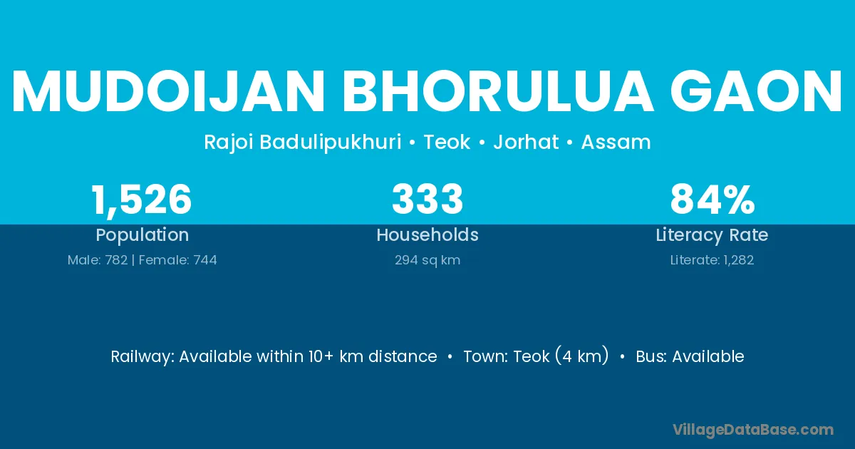 Mudoijan Bhorulua Gaon village has a total population of 1,526 people, of which 782 are males and 744 are females.