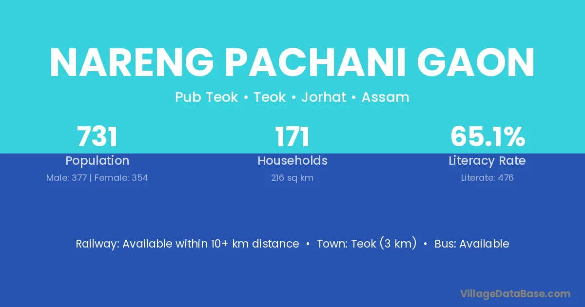 Nareng Pachani Gaon village has a total population of 731 people, of which 377 are males and 354 are females.