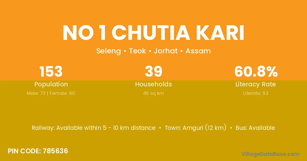 No 1 Chutia Kari village has a total population of 153 people, of which 73 are males and 80 are females.