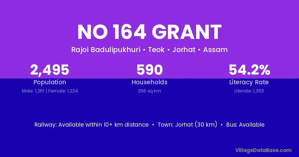 Jorhat (30 km) is the nearest town to No 164 Grant village for major economic activities and is located approximately 30 km away.