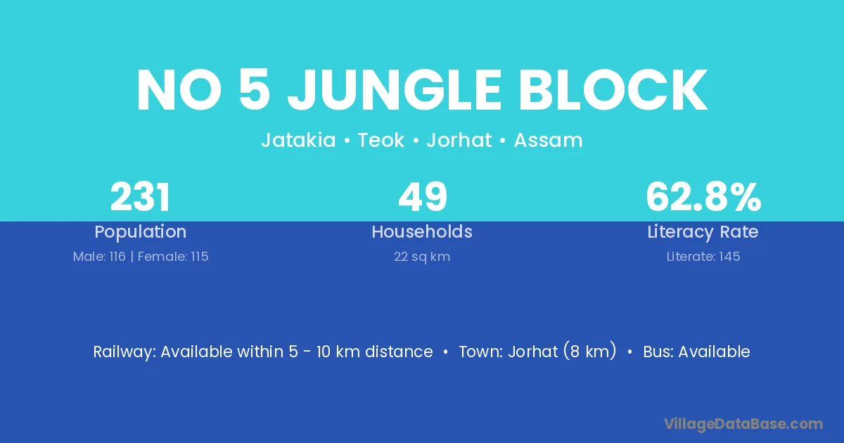No 5 Jungle Block village has a total population of 231 people, of which 116 are males and 115 are females.
