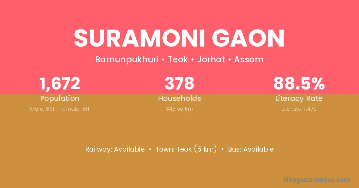 Suramoni Gaon village has a total population of 1,672 people, of which 861 are males and 811 are females.