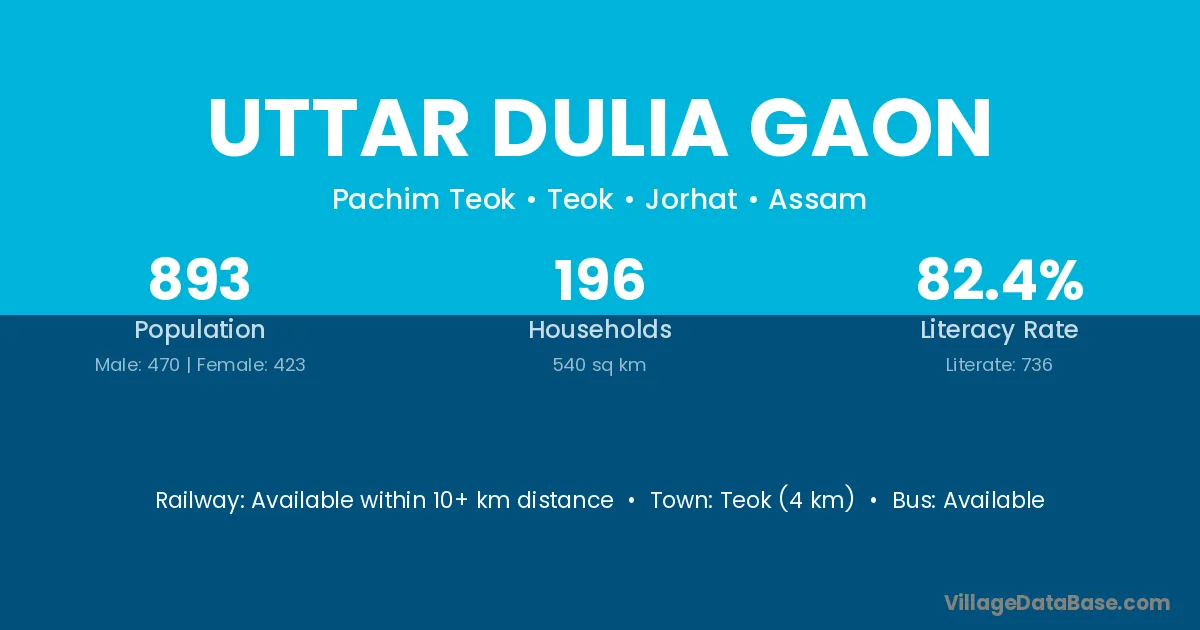 Teok (4 km) is the nearest town to Uttar Dulia Gaon village for major economic activities and is located approximately 4 km away.
