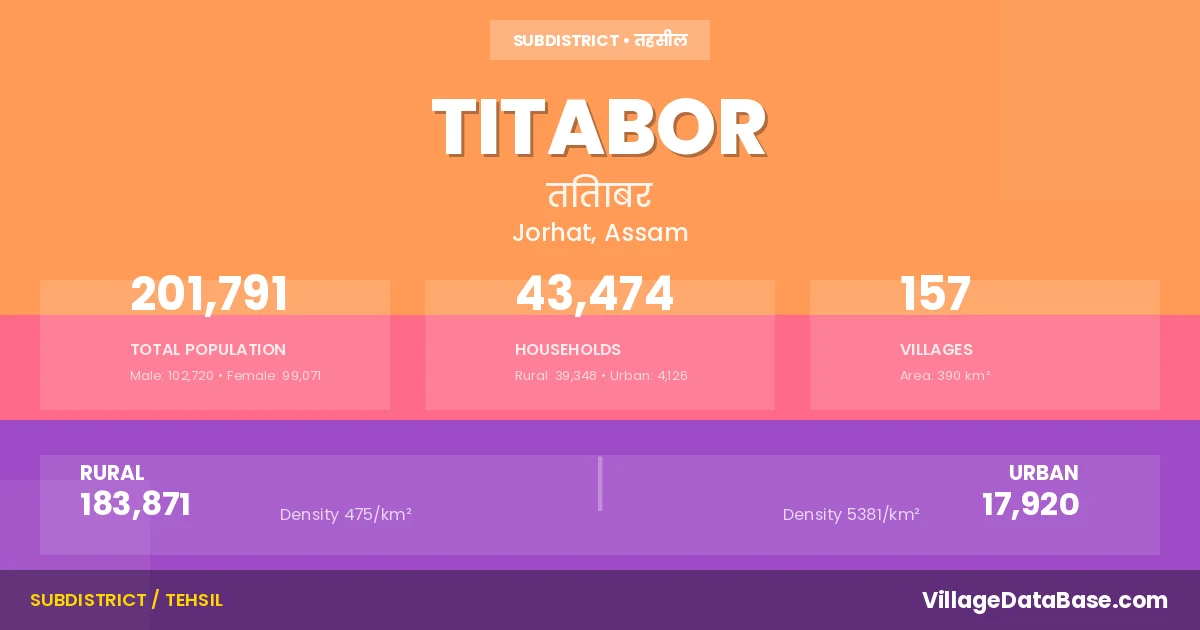 According to the 2011 census The total area of Titabor Subdivision is 390 km², with a population of 201791 people. The population density is 517 inhabitants per square kilometre, and there are approximately 43474 houses in the sub district.