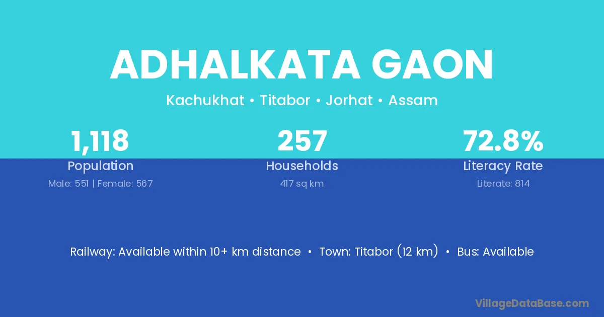 Titabor (12 km) is the nearest town to Adhalkata Gaon village for major economic activities and is located approximately 12 km away.