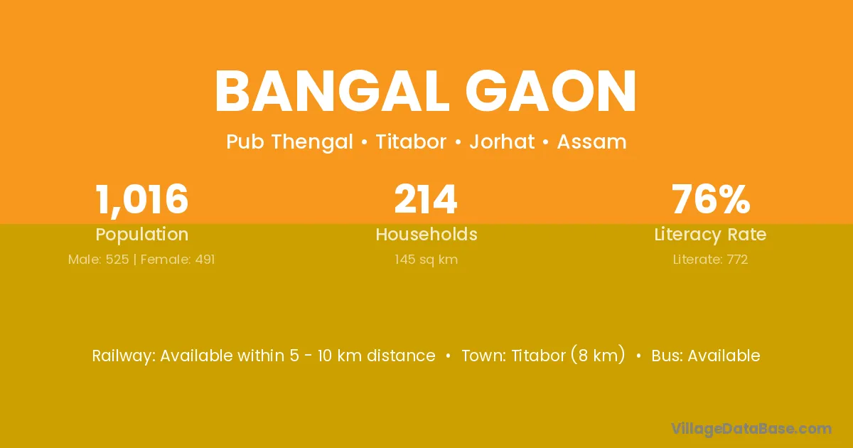 Titabor (8 km) is the nearest town to Bangal Gaon village for major economic activities and is located approximately 8 km away.