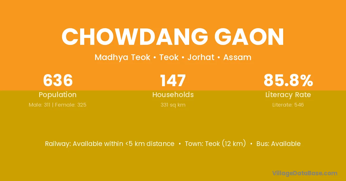 Titabor (3 km) is the nearest town to Chowdang Gaon village for major economic activities and is located approximately 3 km away.