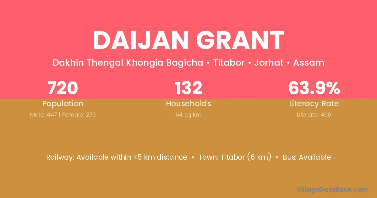 Titabor (6 km) is the nearest town to Daijan Grant village for major economic activities and is located approximately 6 km away.