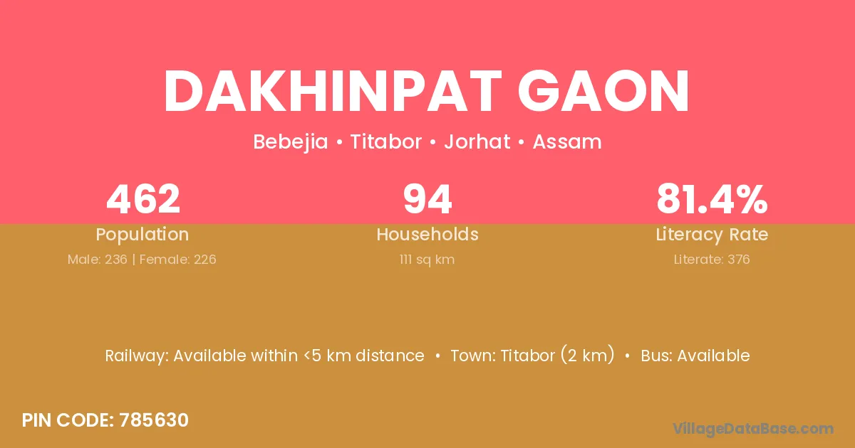 Dakhinpat Gaon village has a total population of 462 people, of which 236 are males and 226 are females.
