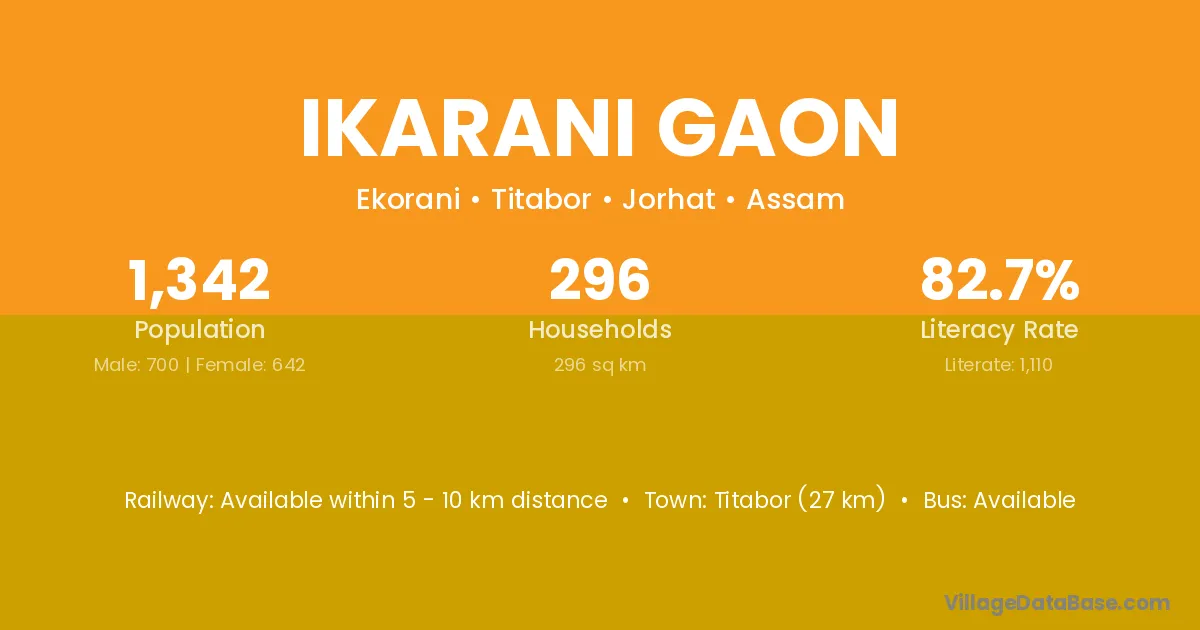 Titabor (27 km) is the nearest town to Ikarani Gaon village for major economic activities and is located approximately 27 km away.