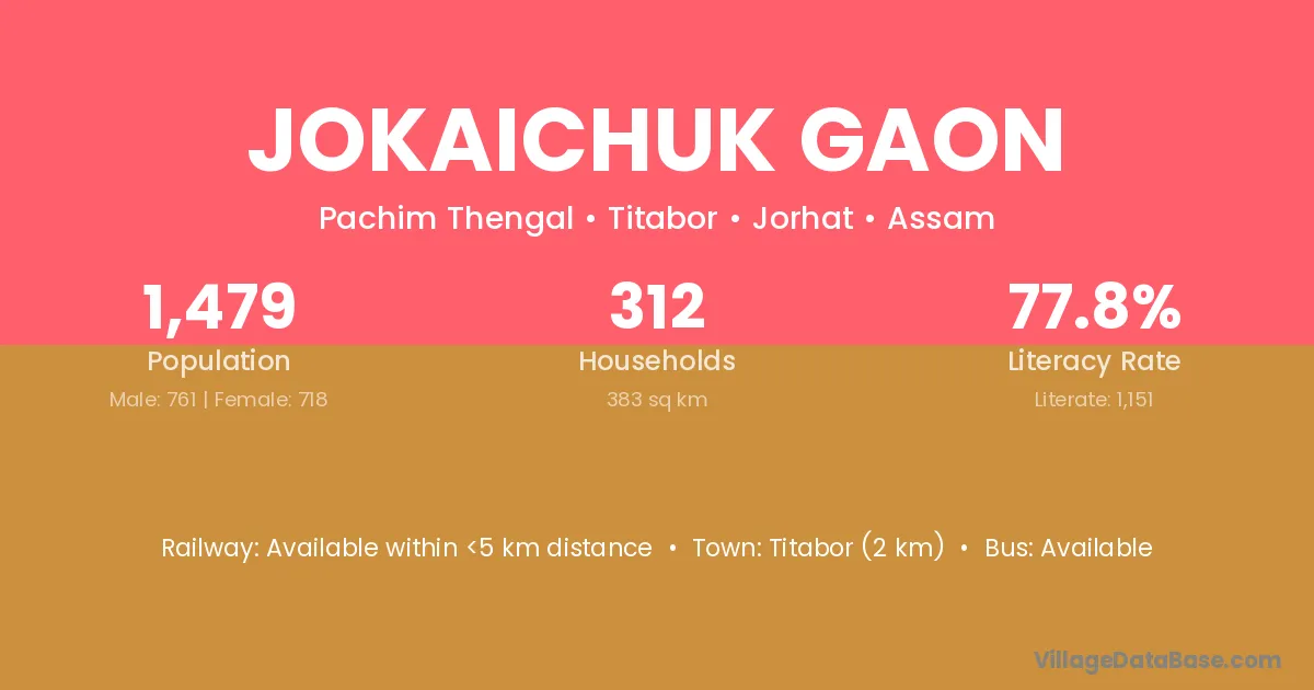 Titabor (2 km) is the nearest town to Jokaichuk Gaon village for major economic activities and is located approximately 2 km away.