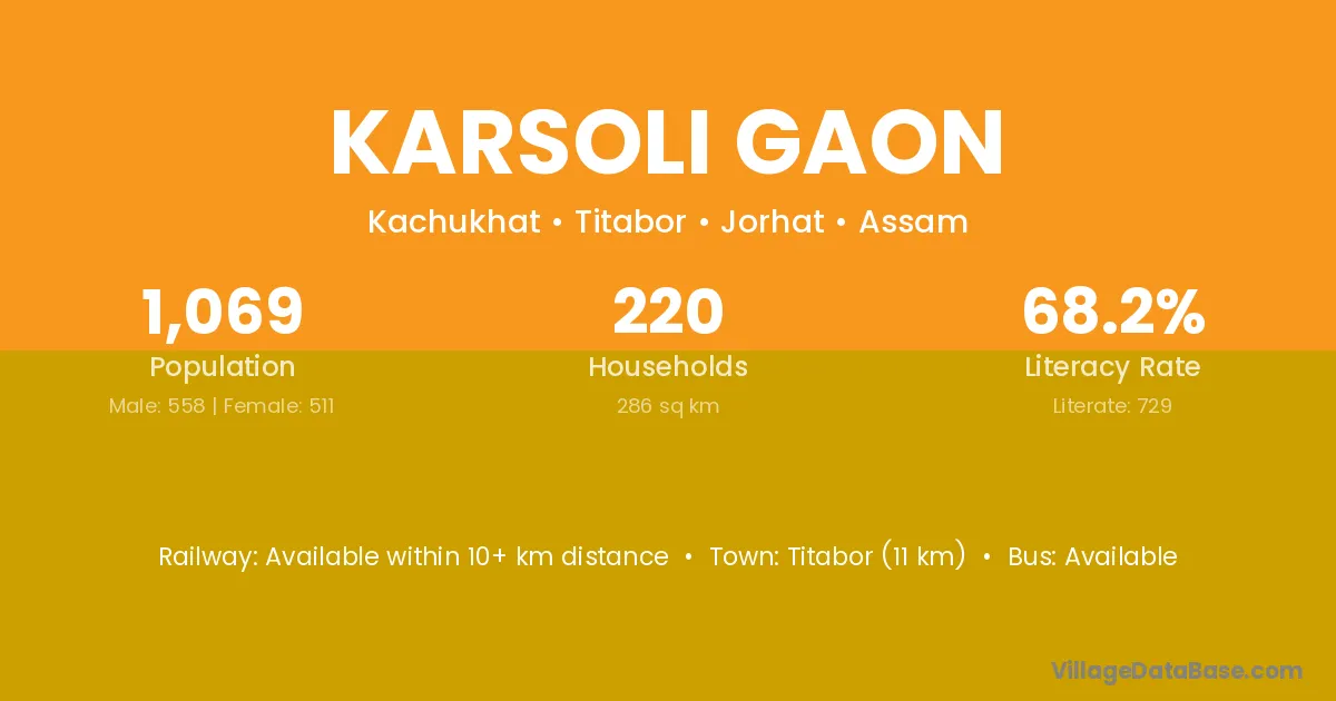 Titabor (11 km) is the nearest town to Karsoli Gaon village for major economic activities and is located approximately 11 km away.