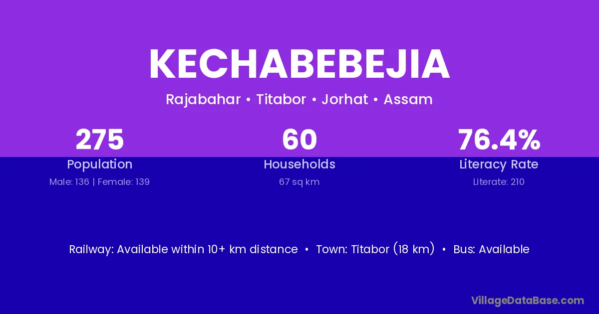 Titabor (18 km) is the nearest town to Kechabebejia village for major economic activities and is located approximately 18 km away.