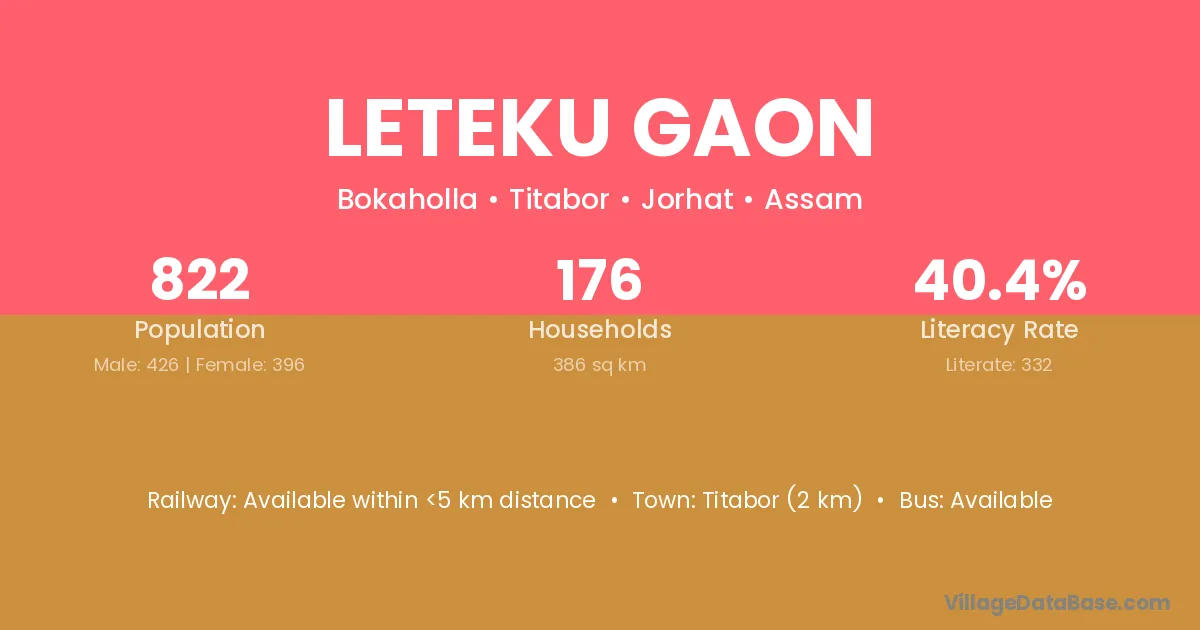 Titabor (2 km) is the nearest town to Leteku Gaon village for major economic activities and is located approximately 2 km away.