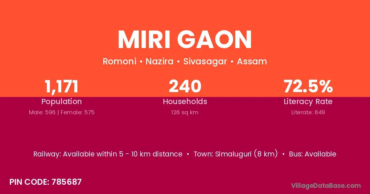 Titabor (28 km) is the nearest town to Miri Gaon village for major economic activities and is located approximately 28 km away.