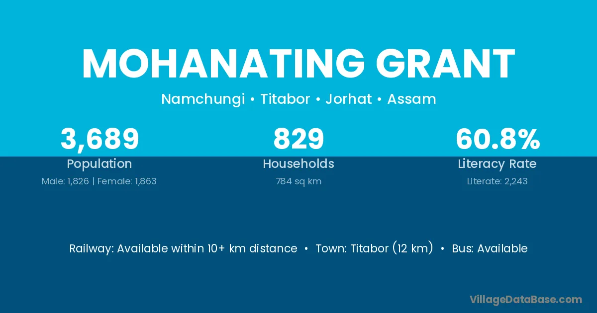 Titabor (12 km) is the nearest town to Mohanating Grant village for major economic activities and is located approximately 12 km away.