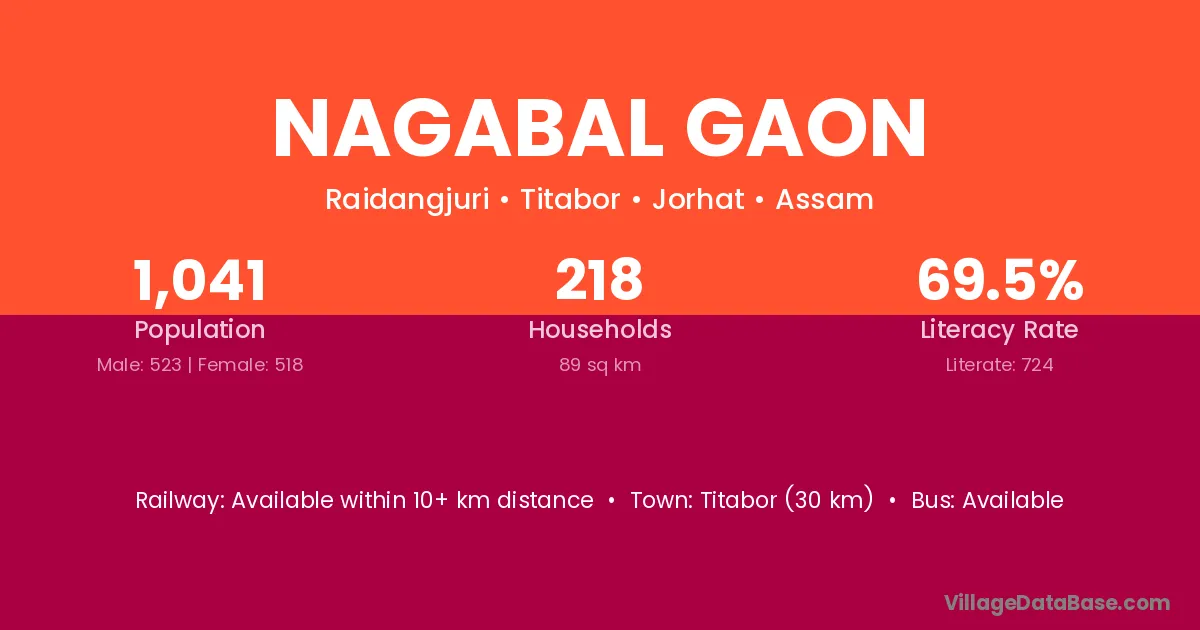 Nagabal Gaon village has a total population of 1,041 people, of which 523 are males and 518 are females.
