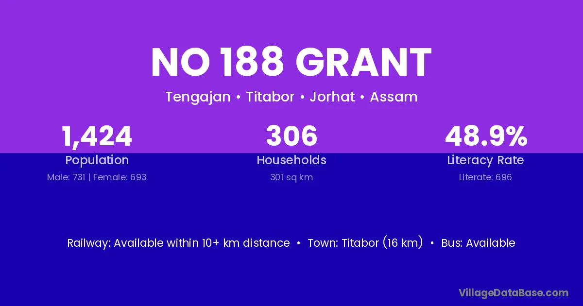 Titabor (16 km) is the nearest town to No 188 Grant village for major economic activities and is located approximately 16 km away.