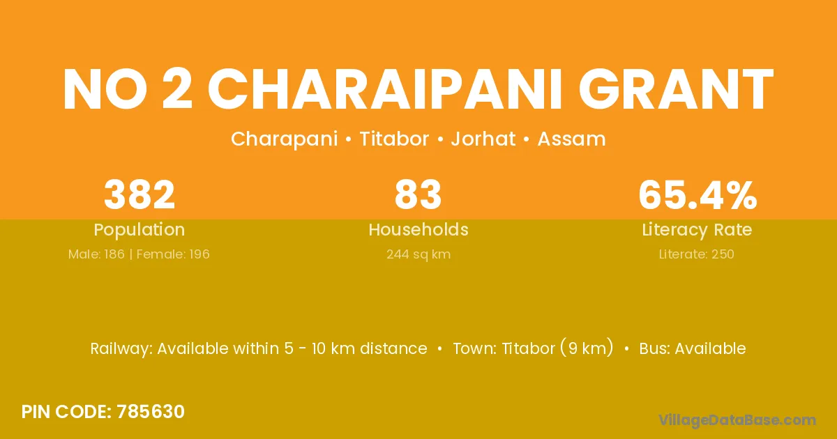 Titabor (9 km) is the nearest town to No 2 Charaipani Grant village for major economic activities and is located approximately 9 km away.