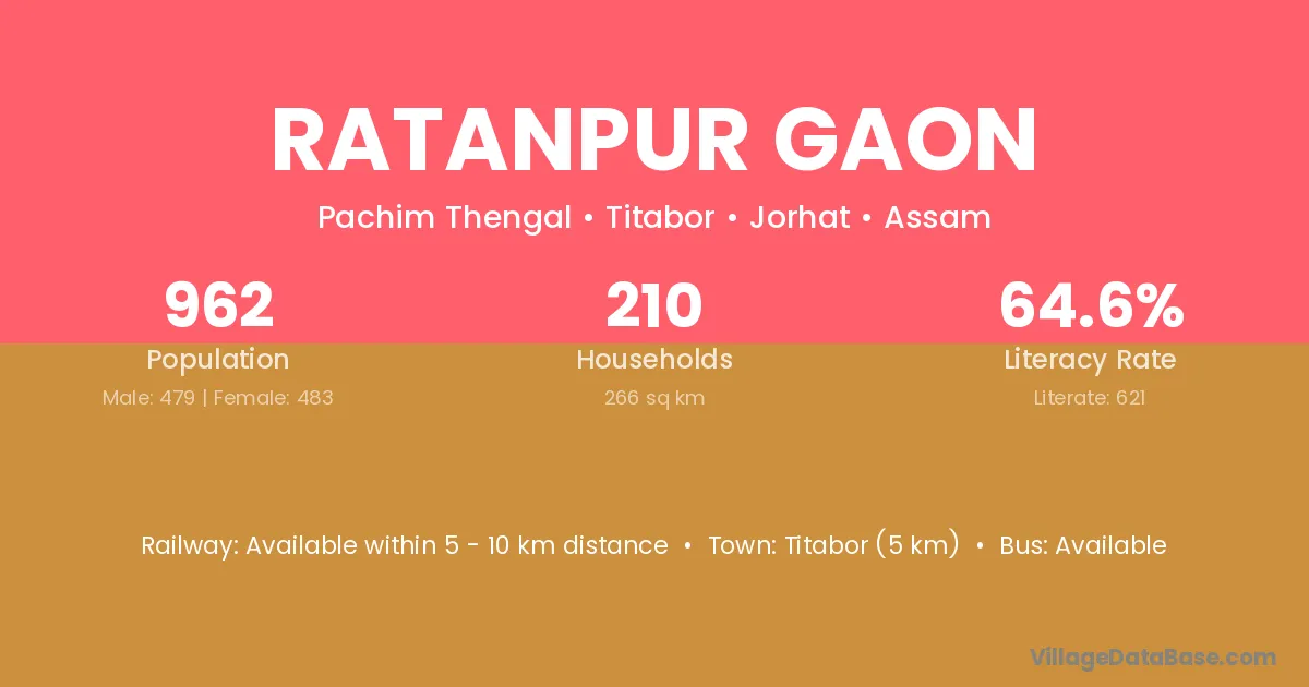 Titabor (5 km) is the nearest town to Ratanpur Gaon village for major economic activities and is located approximately 5 km away.