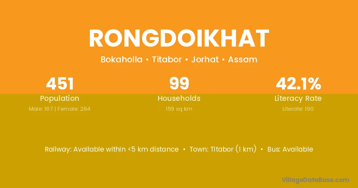 Titabor (1 km) is the nearest town to Rongdoikhat village for major economic activities and is located approximately 1 km away.