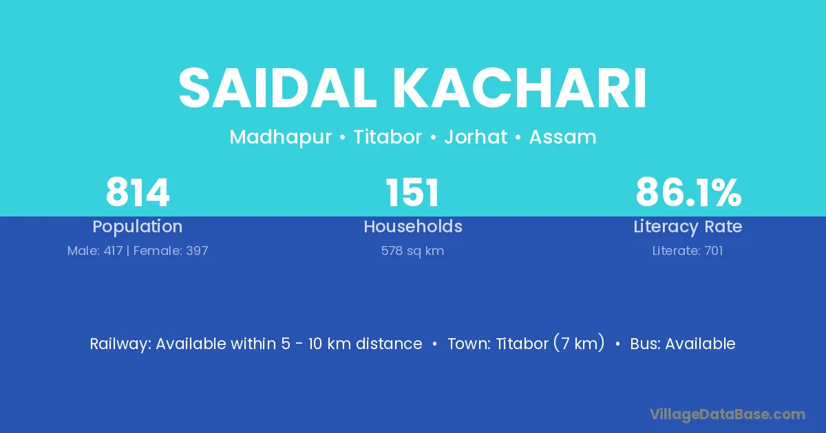 Titabor (7 km) is the nearest town to Saidal Kachari village for major economic activities and is located approximately 7 km away.