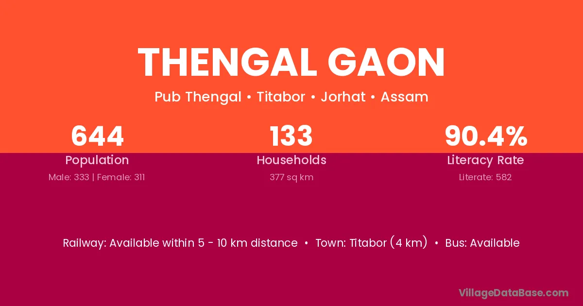 Titabor (4 km) is the nearest town to Thengal Gaon village for major economic activities and is located approximately 4 km away.