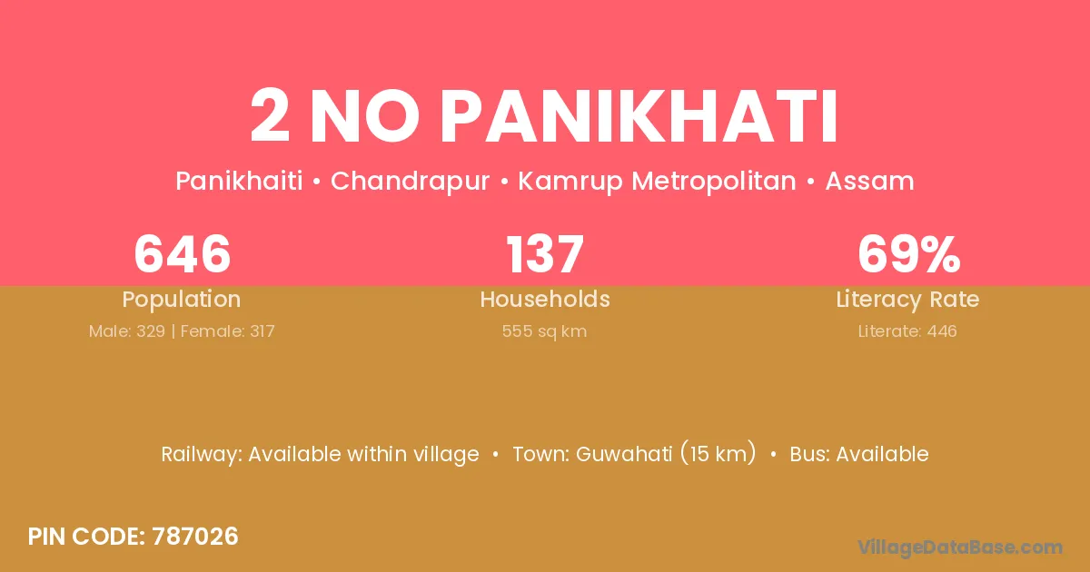 Guwahati (15 km) is the nearest town to 2 No Panikhati village for major economic activities and is located approximately 15 km away.
