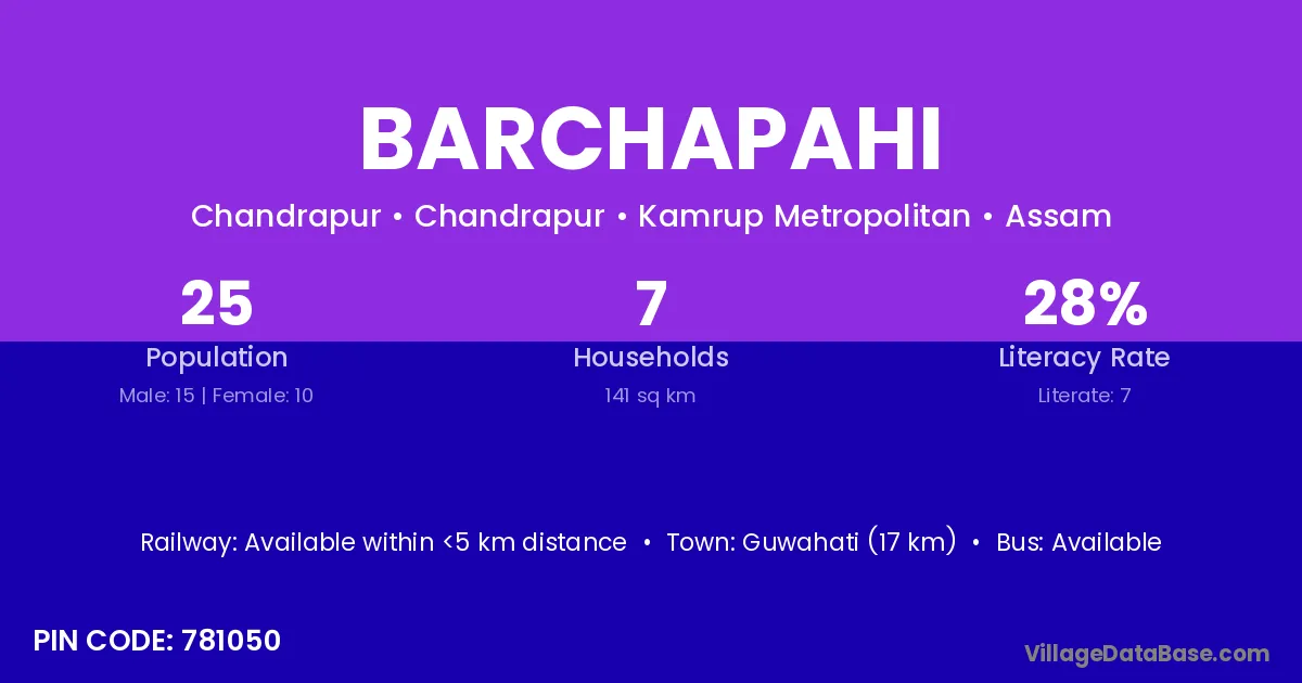 Guwahati (17 km) is the nearest town to Barchapahi village for major economic activities and is located approximately 17 km away.