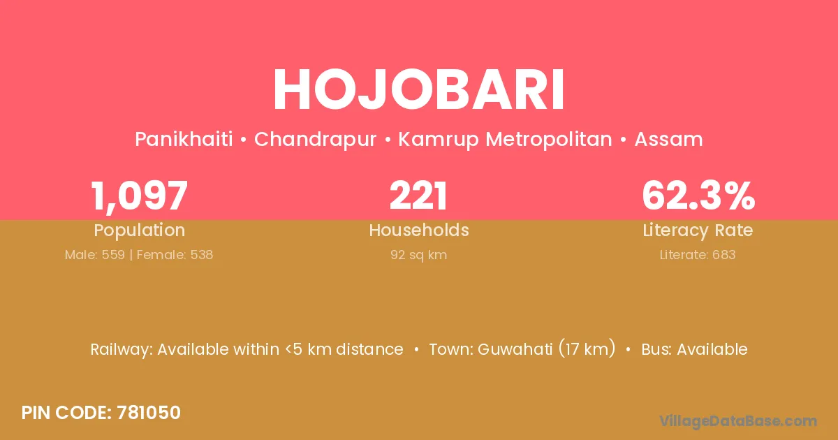 Guwahati (17 km) is the nearest town to Hojobari village for major economic activities and is located approximately 17 km away.