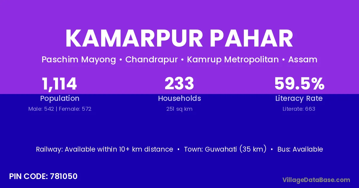Guwahati (35 km) is the nearest town to Kamarpur Pahar village for major economic activities and is located approximately 35 km away.