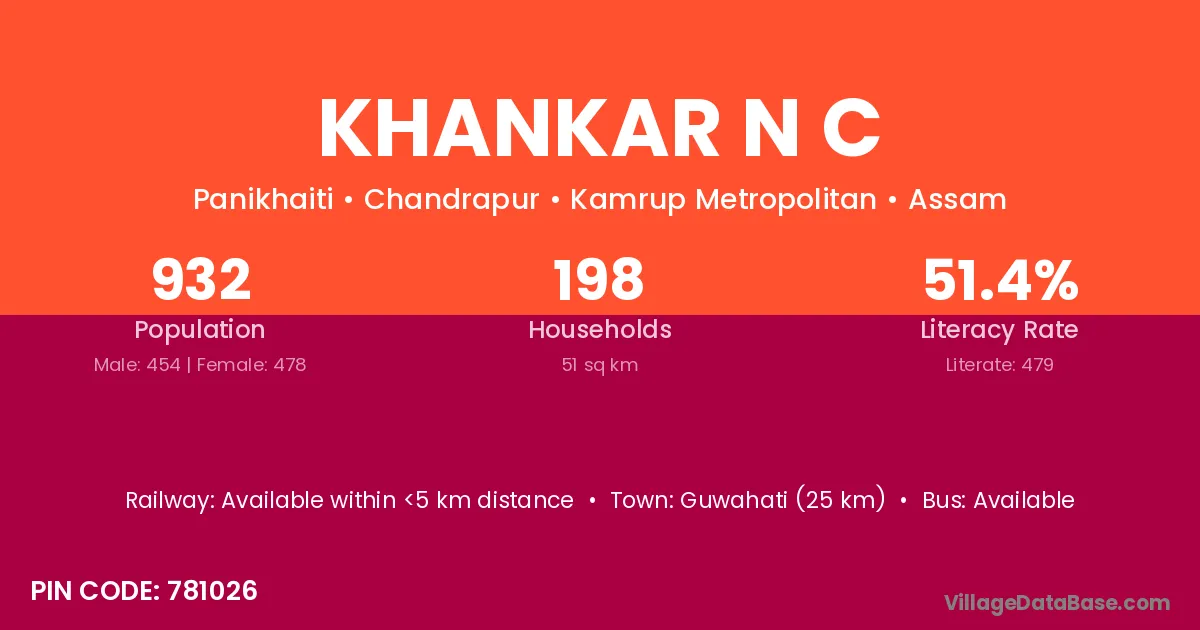 Guwahati (25 km) is the nearest town to Khankar N C village for major economic activities and is located approximately 25 km away.