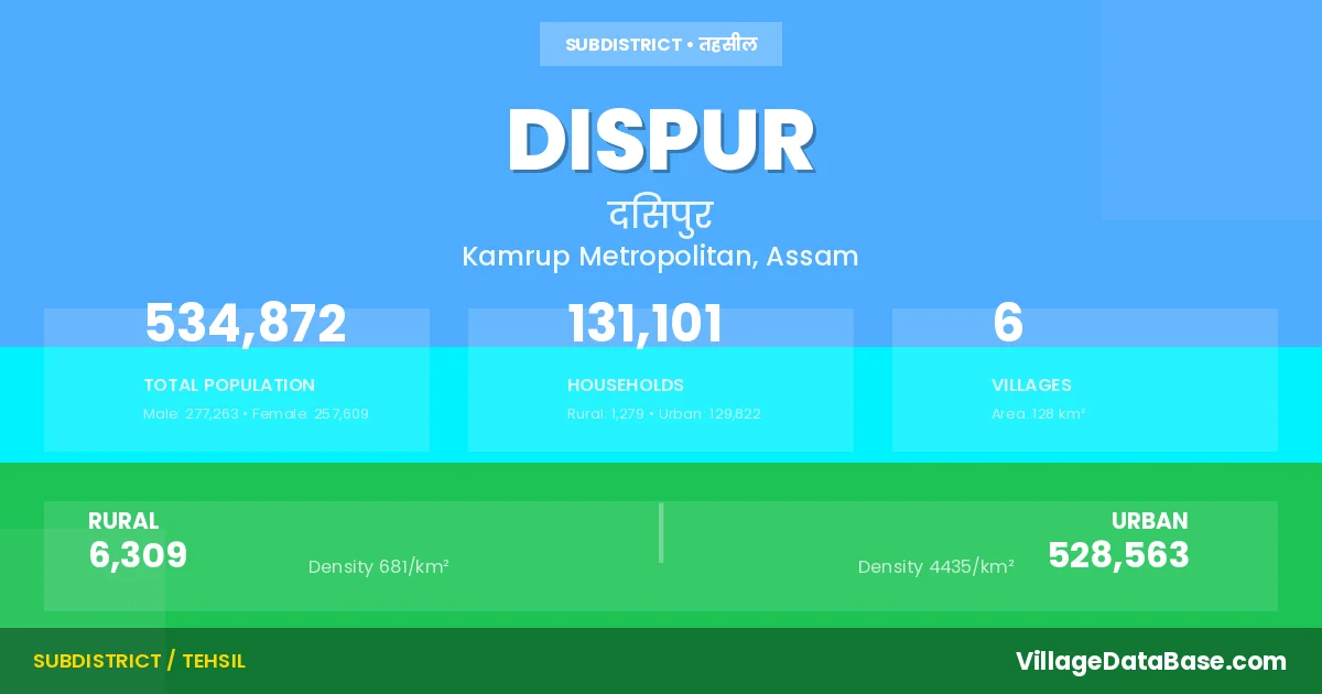 Dispur Subdivision comprises about 6 villages. Below is a list of these villages along with information about their respective gram panchayats and the nearest town: