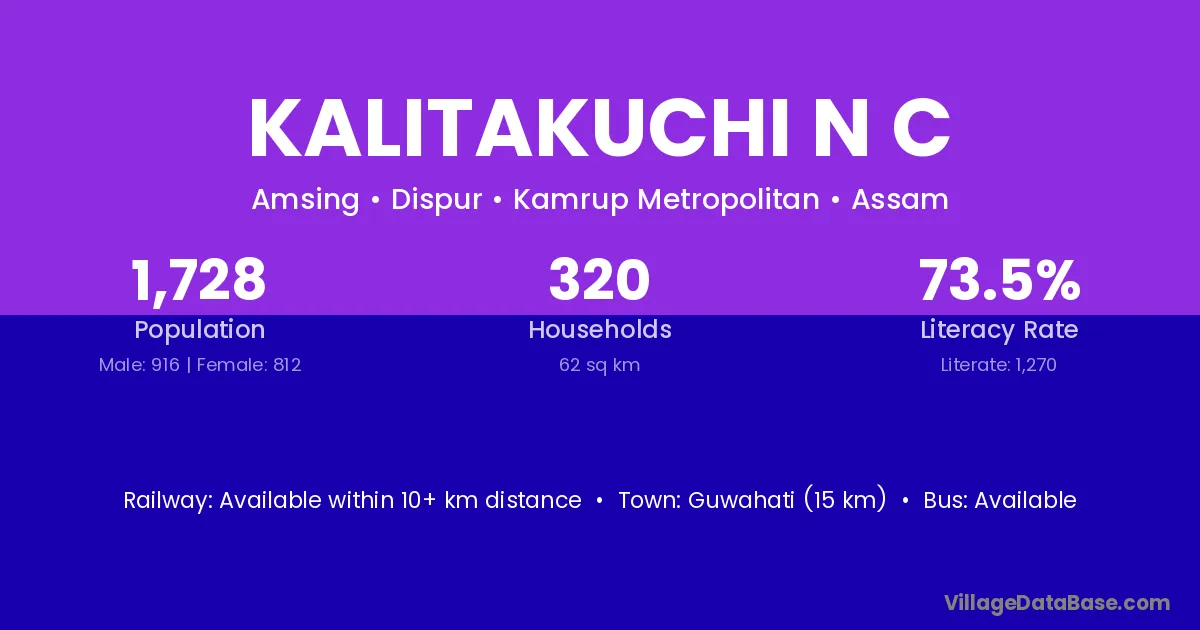 Guwahati (15 km) is the nearest town to Kalitakuchi N C village for major economic activities and is located approximately 15 km away.