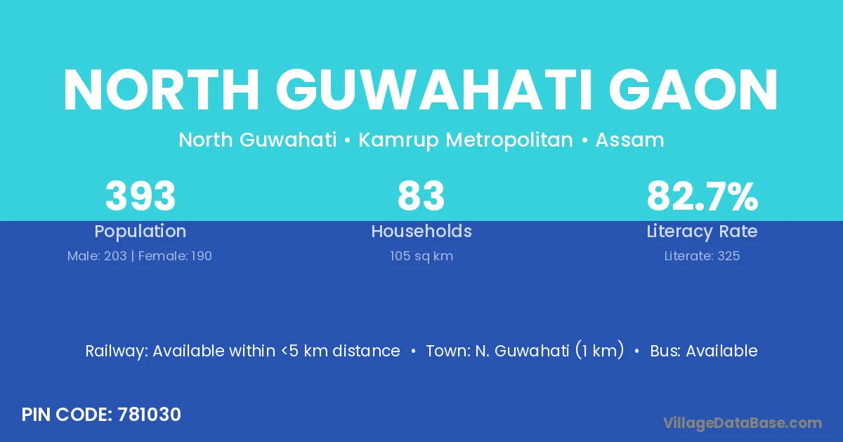 North Guwahati Gaon village has a total population of 393 people, of which 203 are males and 190 are females.