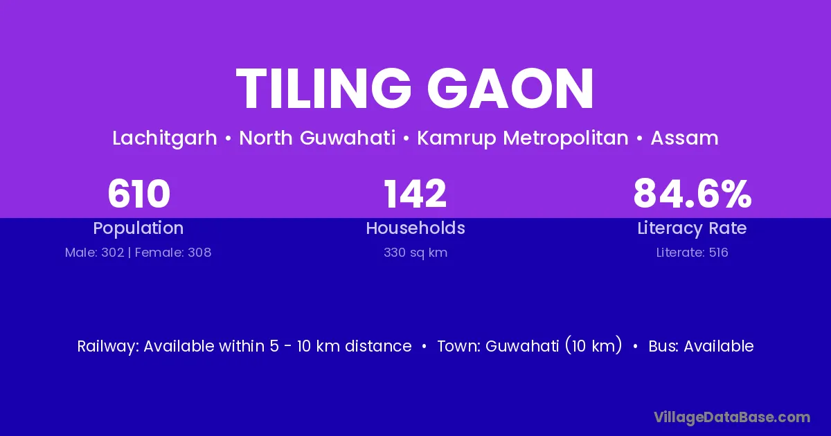 Guwahati (10 km) is the nearest town to Tiling Gaon village for major economic activities and is located approximately 10 km away.