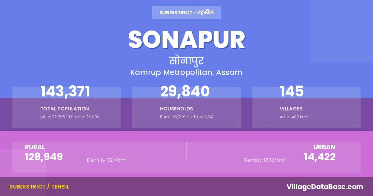 According to the 2011 census The total area of Sonapur Subdivision is 402 km², with a population of 143371 people. The population density is 357 inhabitants per square kilometre, and there are approximately 29840 houses in the sub district.