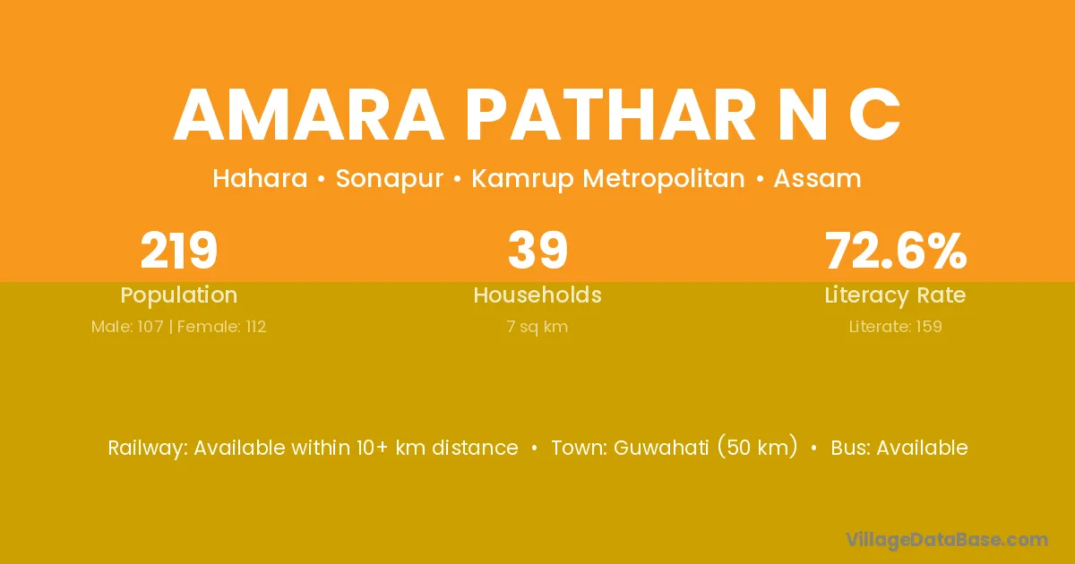 Guwahati (50 km) is the nearest town to Amara Pathar N C village for major economic activities and is located approximately 50 km away.
